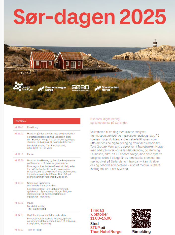 Bak arrangementet står Sparebanken Norge, Eiendomsmegler Norge, SØBO og Næringsforeningen i Kristiansandsregionen. Og det beste av alt – arrangementet er gratis.